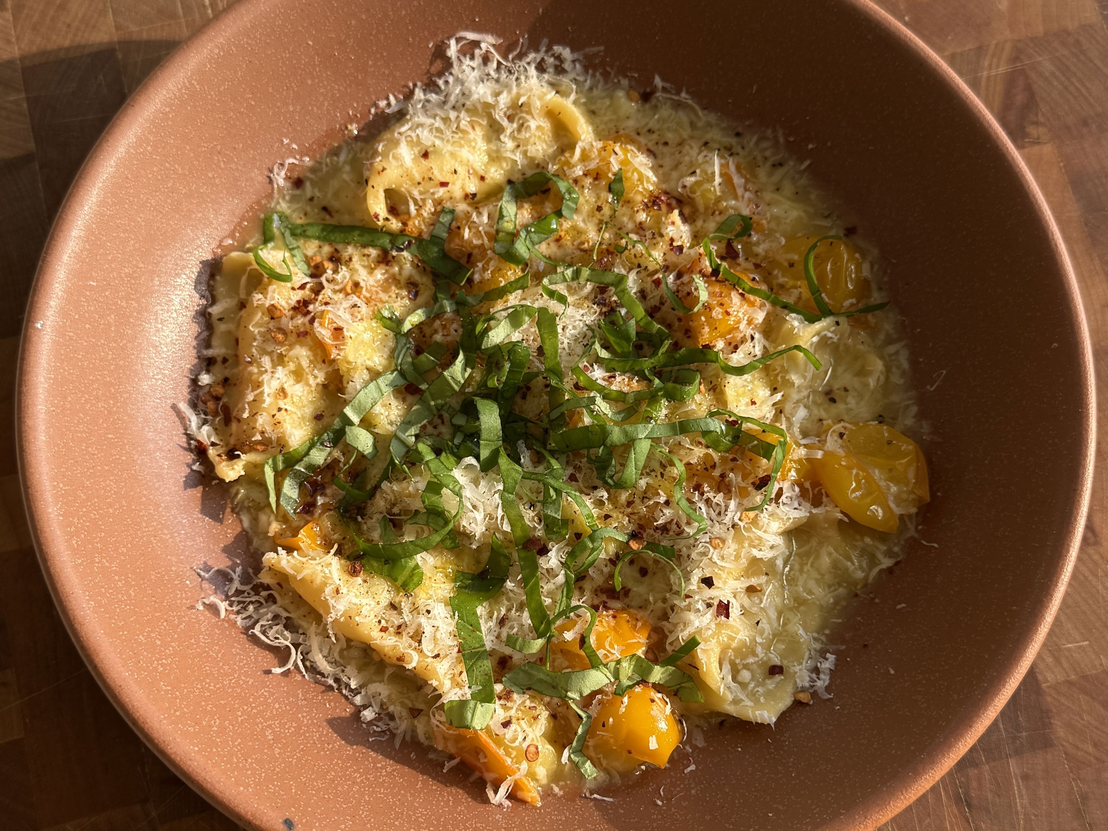 Growing up, my mom had a number of go-to rotating meals based on dishes her own grandma would make. My favorite was the one where she’d saute zucchini in a pan with thin slices of garlic until the squash became caramelized, soft and sweet. In a separate pan, she’d cook down cherry tomatoes until they became saucy, then would toss everything together with rigatoni and cover it all in ricotta and parm. It was a quick meal that did not cut corners in terms of flavor. I reimagined that dish as an anglotti, swapping the cherry tomatoes for sungolds and cooking the sauce down with a little butter and wine.