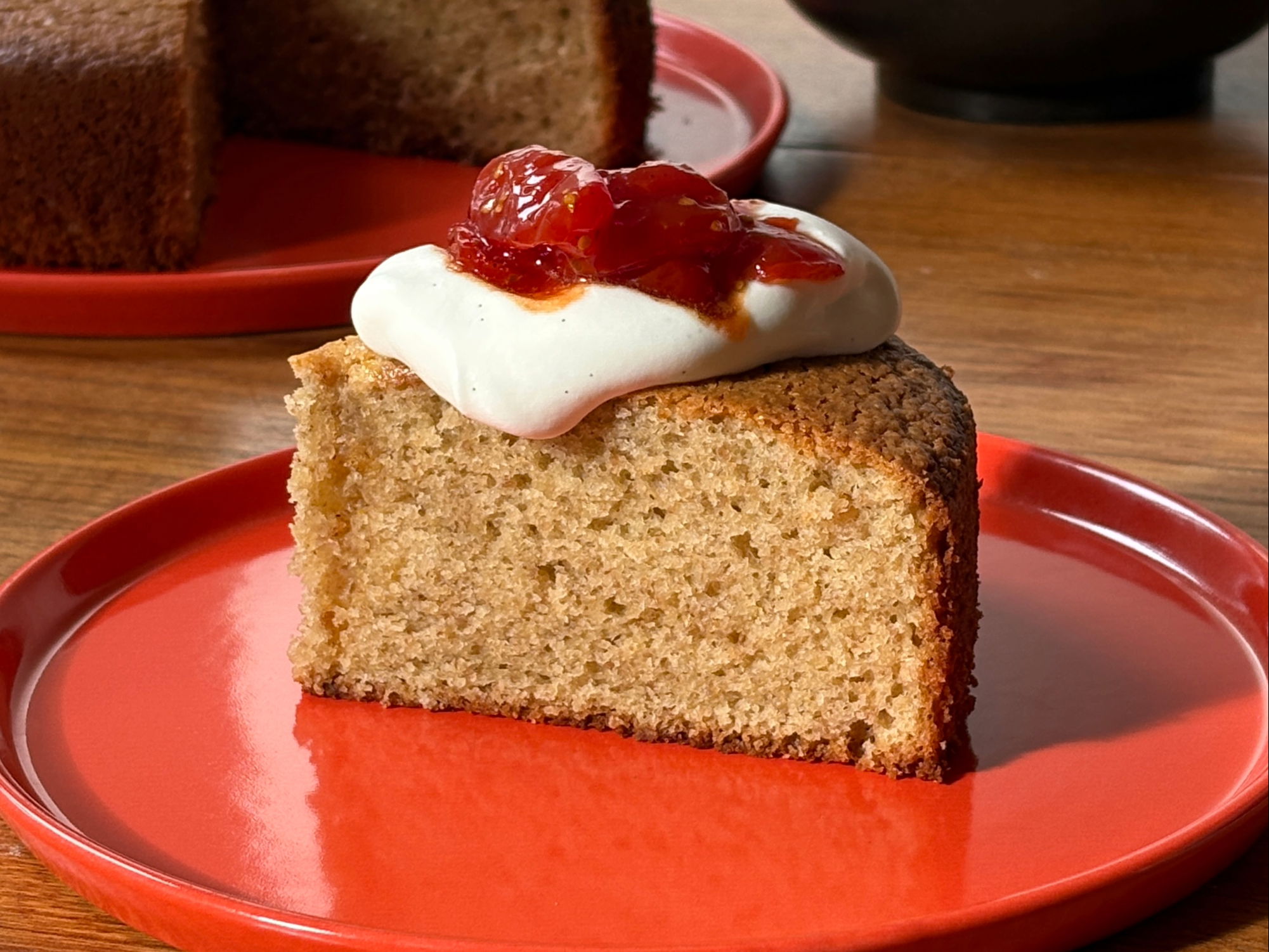 This olive oil snacking cake has a plush, moist crumb that could easily stand on its own, but when you top it with vanilla-stewed tomatoes and a tangy, lightly sour whipped cream, it truly sings. Not too sweet, slightly savory, and full of bright, unexpected flavor, it’s quick to make but tastes like something far more sophisticated.